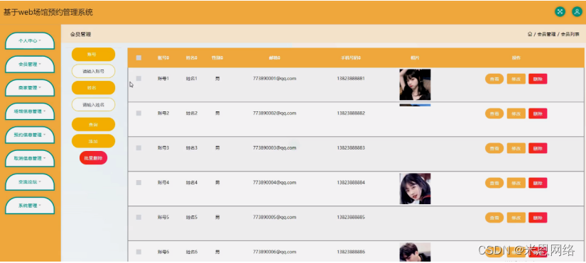 会员管理,管理员可在会员管理页面查看账号、姓名、性别、邮箱、手机号码、相片等内容,还可进行添加、修改或删除等操作,如图5-11所示。