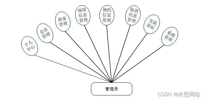 (a) 管理员;管理员使用本系统涉到的功能主要有:个人中心、会员管理、商家管理、场馆信息管理、预约信息管理、取消信息管理、交流论坛、系统管理等功能。管理员用例图如图3-1所示。