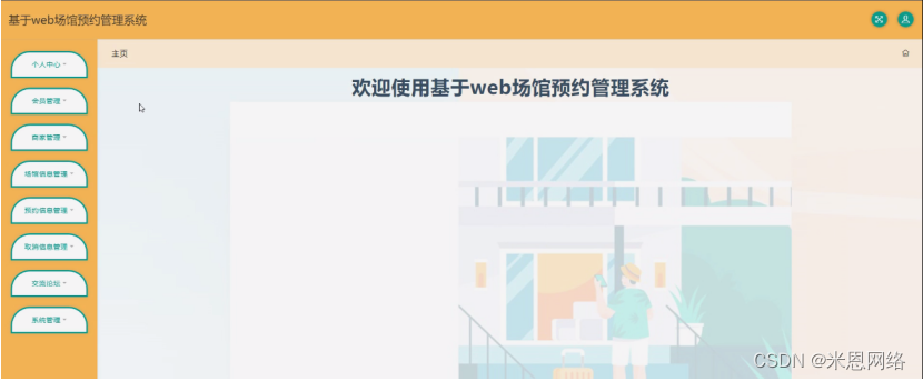 管理员通过登录进入基于web场馆预约管理系统可查看个人中心、会员管理、商家管理、场馆信息管理、预约信息管理、取消信息管理、交流论坛、系统管理等内容,如图5-10所示。