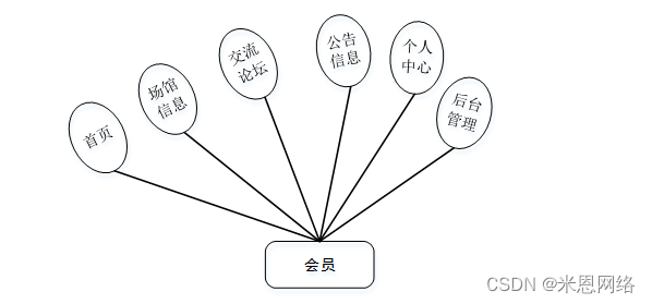 (b)会员进入系统可以实现首页、场馆信息、交流论坛、公告信息、个人中心、后台管理等功能。会员用例图如图3-2所示。