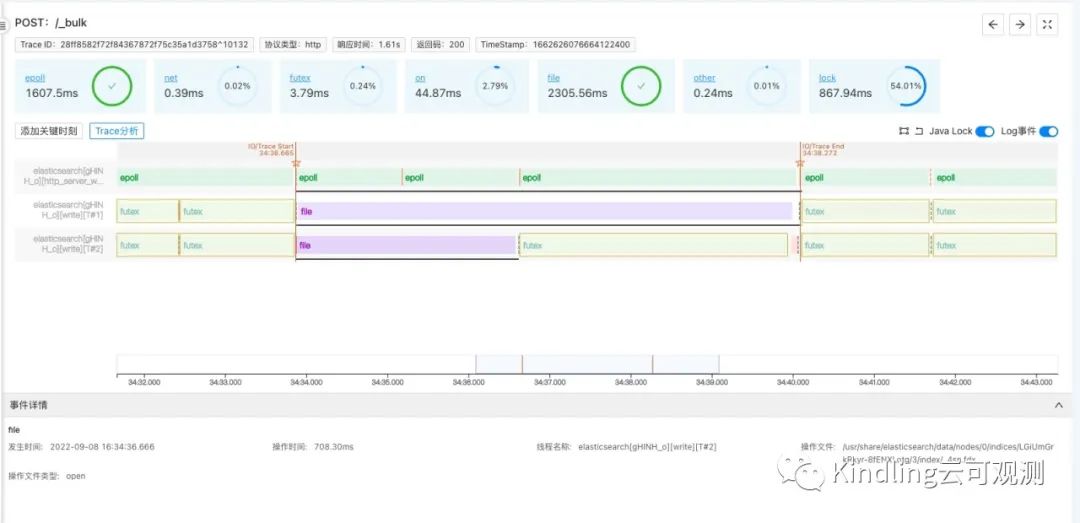 通过和APM trace关联,我们能够得到处理Elastic Search bulk insert操作是由三个线程并发同时工作完成的,在摄像头界面都会以下划线高亮出处理请求的线程。同时线程呈现了IO trace start与IO trace end,这个表示是操作系统层面已经开始对此请求开始了读写,具体时间戳我们也记录并展现出来。同时和APM trace对接,我们也记录了Trace start与Trace end,这个是APM的trace开始与结束时间,本次界面当中由于IO trace start和APM trace start 时间基本重合了,但是如果线程池线程不够用,我们就能发现IO trace start已经开始一段时间了,APM trace start 才开始的情况。