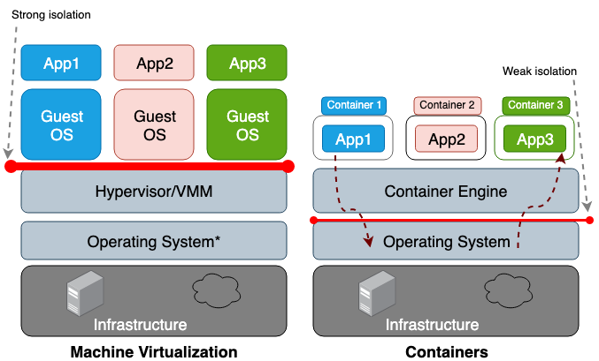 相对于命名空间隔离技术而言,虚拟化硬件隔离通常会有更好的安全边界。容器(进程)中逃出的攻击者,往往比虚拟机中逃出的攻击者具有更大的威胁。命名空间和 cgroup 的弱隔离是造成这种风险的原因。
