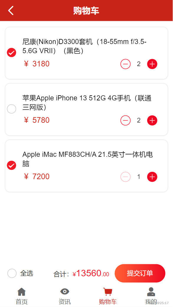 (3)单选控制全选——购物车中所有商品均被选中,全选按钮也被选中