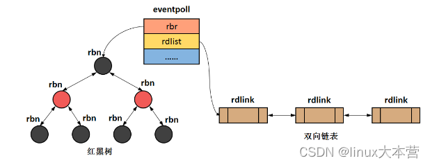 如图所示,eventpoll中包含了两个主要的成员变量,分别是rbr和rdlist,前者指向红黑树的根节点,后者指向双链表的头结点。即一个eventpoll对象对应二个epitem的容器。对epitem的检索,将发生在这两个容器上(红黑树和双链表)。