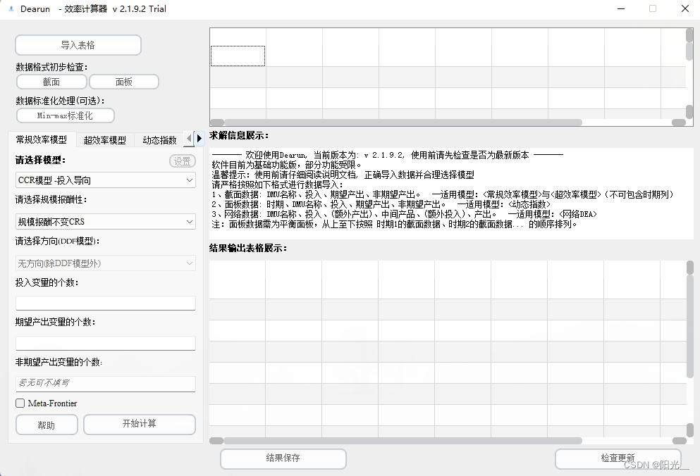大部分刚接触DEA的研究人员,可能都会对这类优化模型有着很深的疑惑,不知从何下手。如果想彻底明白DEA模型的机理,必须熟练掌握并运用运筹学的相关知识,包括如何建立、求解、分析优化模型,这意味着较高的学习成本。目前市面上也有一些软件来处理DEA模型,但是免费的软件只能求解简单的CCR/BCC模型,根本无法满足日常的研究需求。这也是开发本软件的初衷,其中包含了当前DEA研究领域的主流模型,包括基础效率模型、超效率模型、网络DEA模型以及动态Malmquist指数分析,并可以处理存在非期望产出的情形。本文将向您介绍Dearun软件的安装、运行流程,便于您更快的上手本软件。