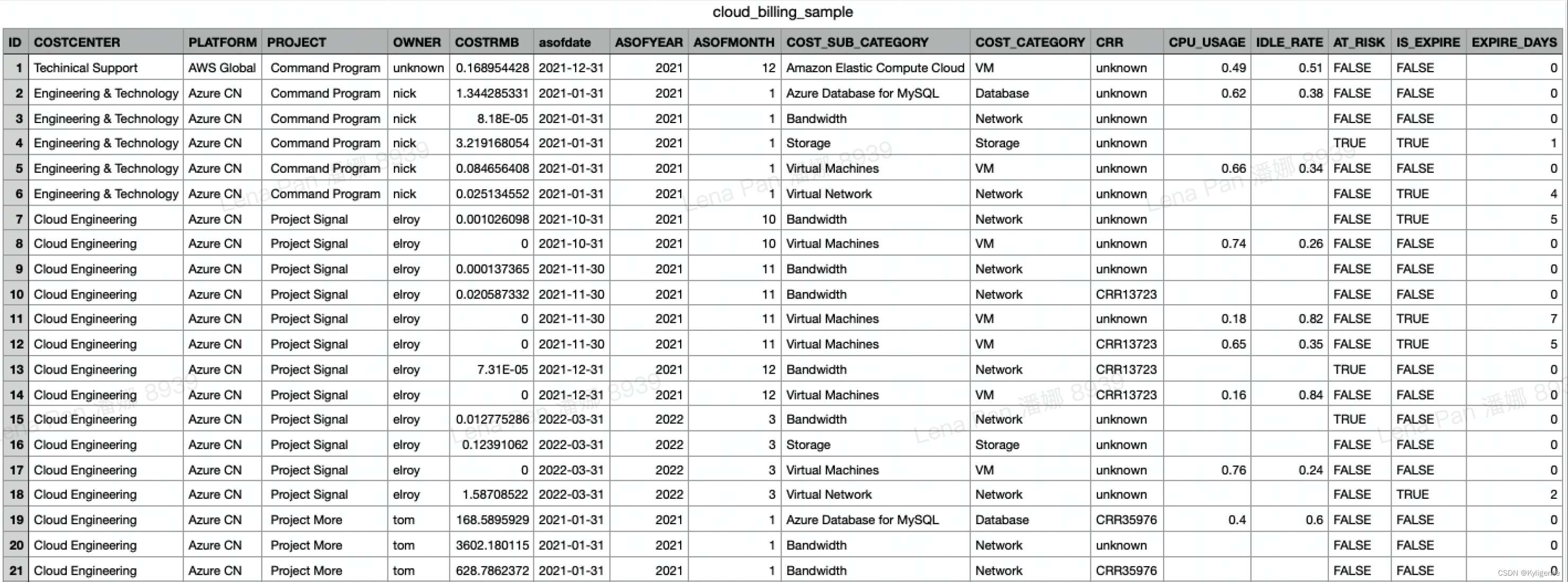 首先,我们在 Kyligence Zen 的数据页面选择上传我们的云账单数据(样例如下),该数据基于云平台账单加工而来。