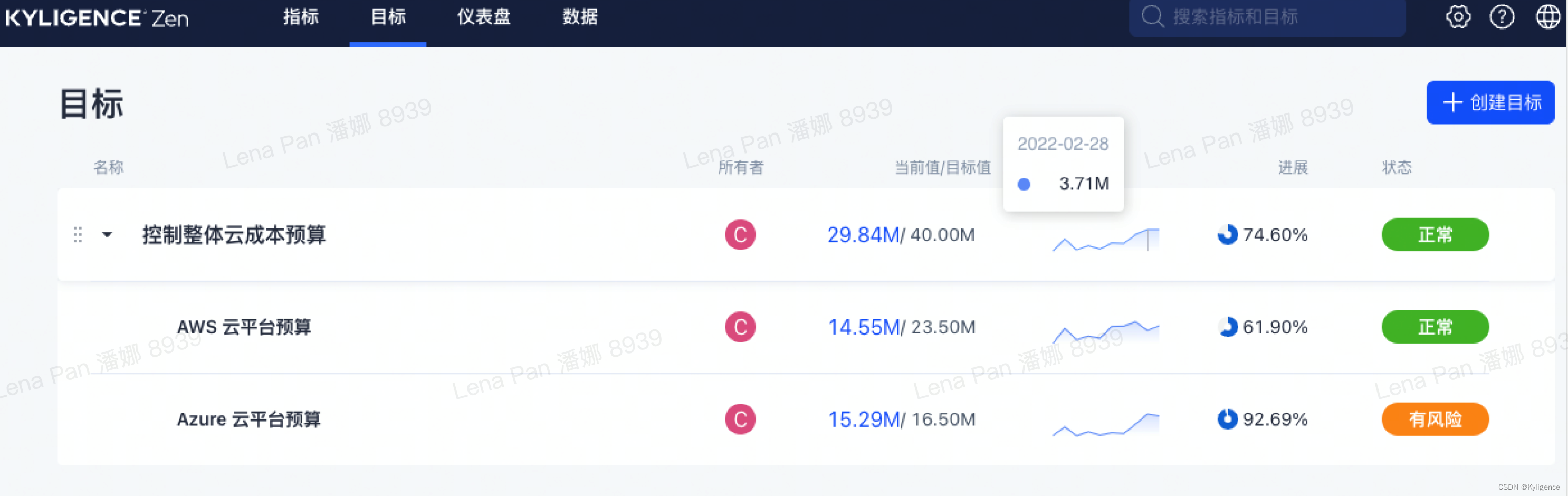 前面我们提到,通过云计算,企业可以对 IT 资源灵活变更和扩展,但是也加速了云成本和使用量的变化,因此,企业必须细化对预算的控制,培养团队的成本意识。我们可以在目标页面中对各云平台的预算设置上限并关联前面创建的指标,可以看到 Azure 云平台的预算即将超期,团队成员在申请新项目时没有特殊需求可以申请 AWS 平台的资源,同时需要注意整体预算的结余。