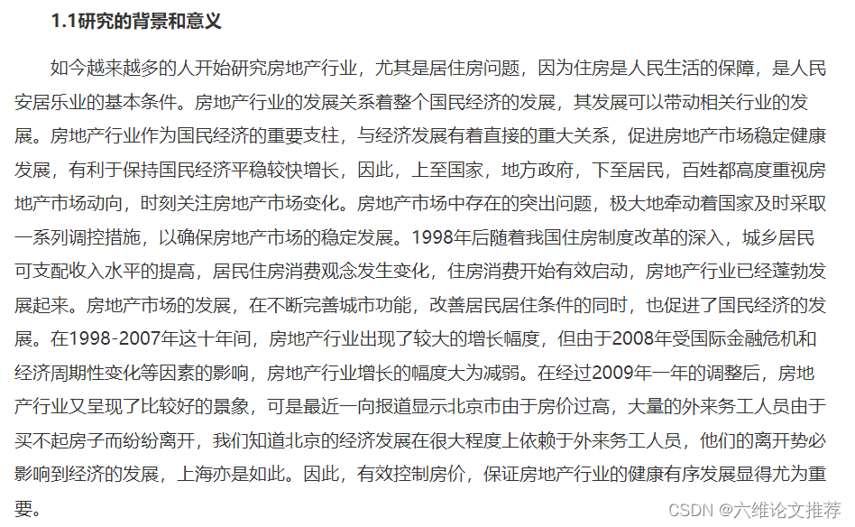 在第一章绪论里面,主要介绍了论文研究相关的背景,研究房地产市场的目的和本文中研究房地产市场时用到的相关理论与方法。在这一部分也指出了论文的创新点和不足之处。