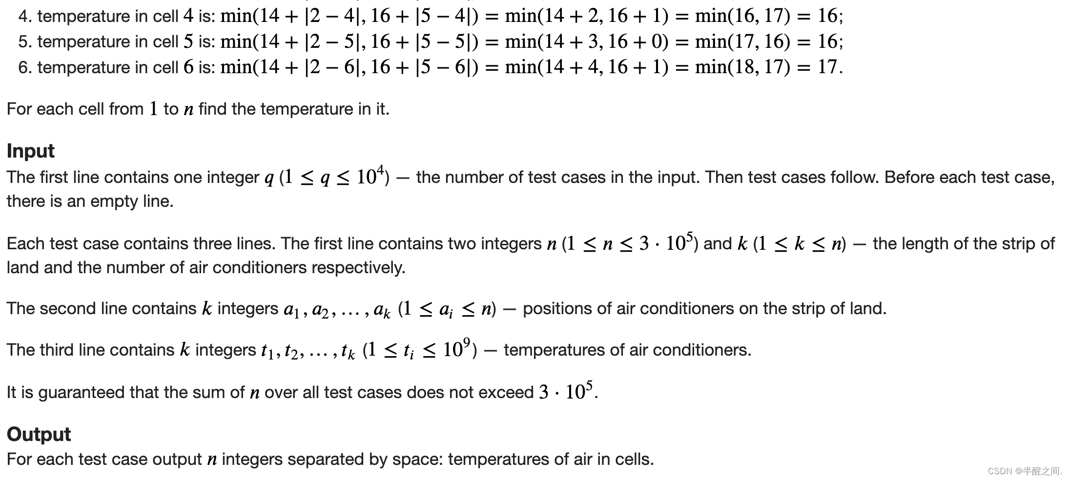 对于每个单元格𝑖(1≤𝑖≤𝑛)找到它的温度,可以由公式计算min1≤𝑗≤𝑘(𝑡𝑗+ |𝑎𝑗−𝑖|),在那里|𝑎𝑗−𝑖|表示绝对值的区别𝑎𝑗−𝑖。