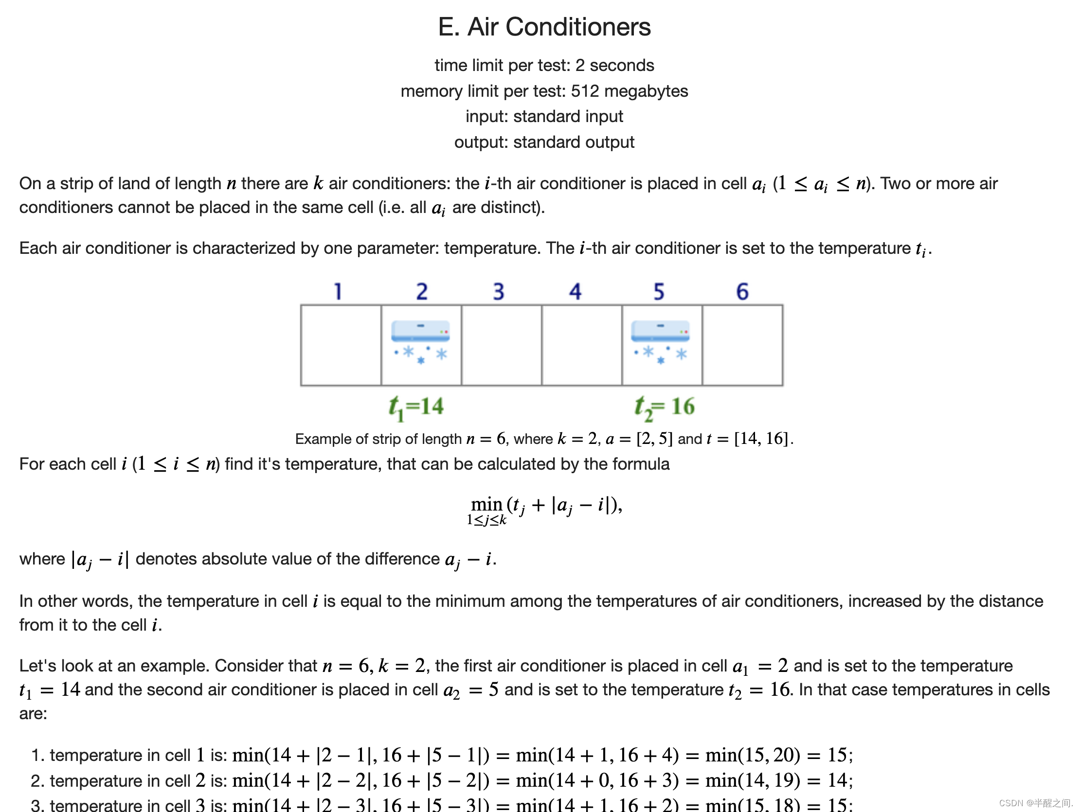 让我们看一个例子。假设𝑛=6,𝑘=2,第一个空调放置在单元𝑎1=2中,并设置为温度𝑡1=14,第二个空调放置在单元𝑎2=5中,并设置为温度𝑡2=16。在这种情况下,细胞内的温度为: