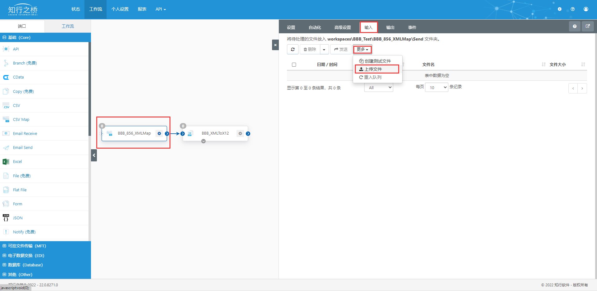 ③点开BBB_856_XMLMap端口,点击上方 输入 ,在 更多里点击上传文件,上传BBB_856_Test.xml。