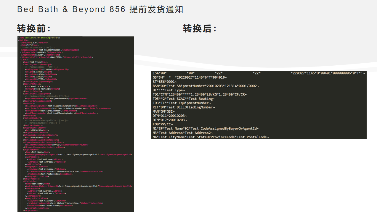 下图为BBB EDI X12 856示例报文转换前及经过知行之桥EDI系统转换后的结果对比图: