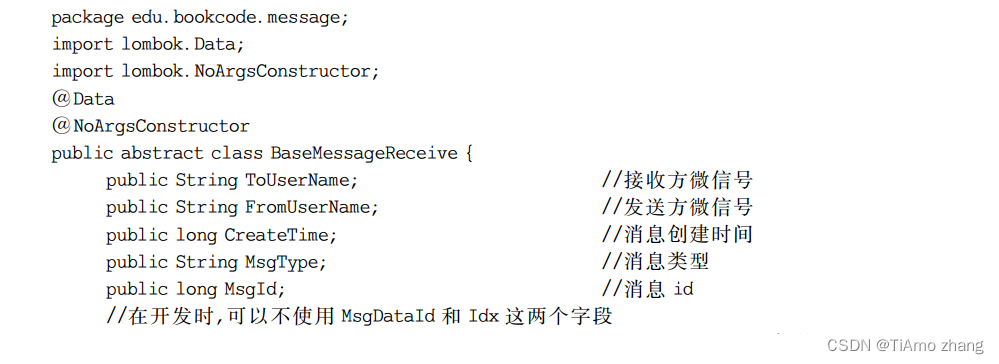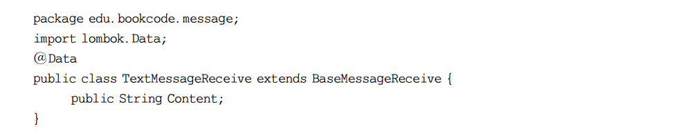 在包edu.bookcode中创建message子包,并在包edu.bookcode.message中创建类BaseMessageReceive,该类中的属性代表了所有收到消息的相同字段,代码如例1所示。