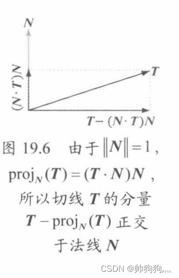 插值完成后,切向量与法向量可能变成非正交规范向量。以上两行代码通过T减去其N方向上的分量(投影),再对结果进行规范化处理,从而使T称为规范化向量且正交于N。