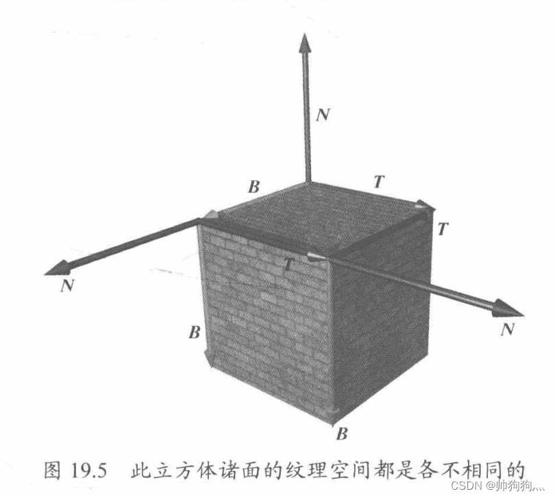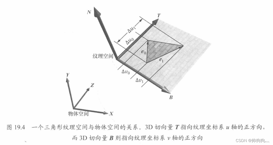 将纹理映射到3D三角形上时,观察纹理坐标系与三角形所处平面的关系。纹理uv坐标与三角形平面重合,再结合三角形的平面法线N,我们便得到了一个位于三角形所在平面内的3D TBN基(TBN-basis),它常被称为纹理空间(texture space)或切线空间(tangent space,正切空间、切空间)。注意:切线空间会随不同的三角形而发生改变👇。