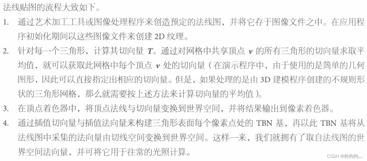 步骤:①我们通过计算网格中共用顶点v的每个三角形的切向量平均值,作为顶点v处的切向量②副切向量的计算同理③计算完上述平均值之后,往往还需要对TBN基进行正交规范化处理,使这3个向量相互正交且具有单位长度[格拉姆-施密特过程]。