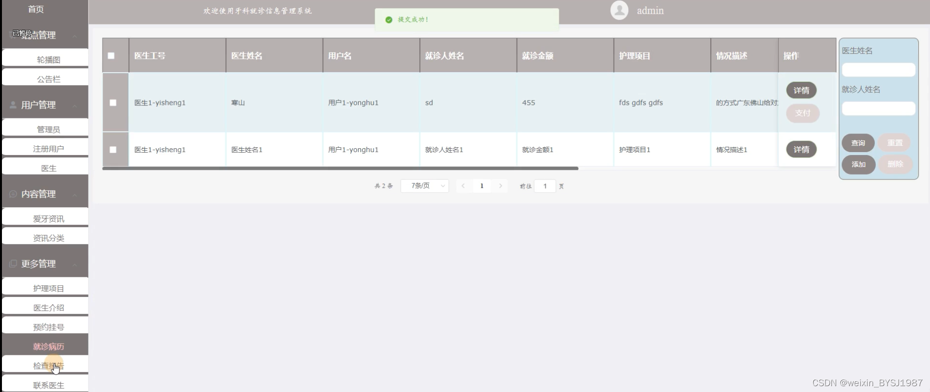 此页面的关键是编辑就诊病例,包括医生工号、医生姓名、用户名、就诊人姓名、就诊金额、护理项目、情况描述等。单击提交按钮以完成信息的添加。如果未写入完整的就诊病例,例如,如果未写入就诊编号,系统将给出相应的错误提示,并且无法成功输入。数据以概念的形式以onsubmit =“return checkForm()”的形式写入以进行检查,checkForm()函数是一种用于写入数据的不同类型的校对方法,是不是为空也是经过form表单中的οnsubmit=”return checkForm()来检查。