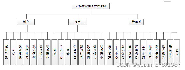 基于牙科就诊信息管理系统的设计基于现有的电脑,可以实现用户管理、护理项目、医生介绍、预约挂号、就诊病例、检查报告、联系医生等详细的了解及统计分析。根据系统功能需求建立的模块关系图如下图:
