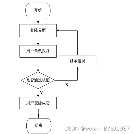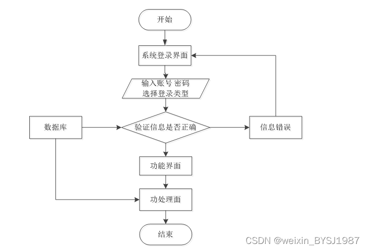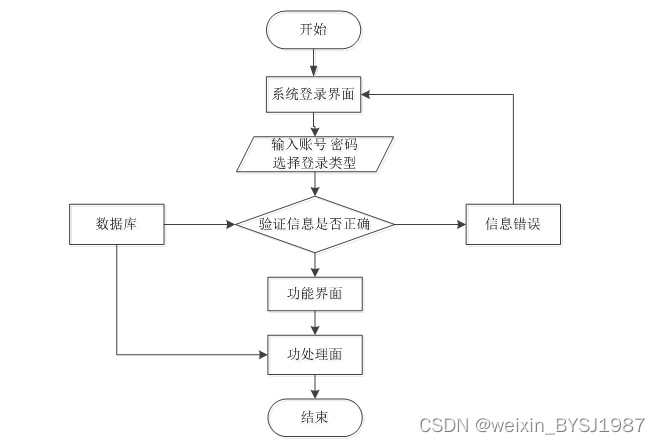 用户想进入系统,首先进入系统登录界面,通过正确的用户名、密码,选择登录类型登录,系统会检查登录信息,信息正确,然后输入相应的功能界面,提示信息错误,登录失败。系统操作流程如图3-4所示。
