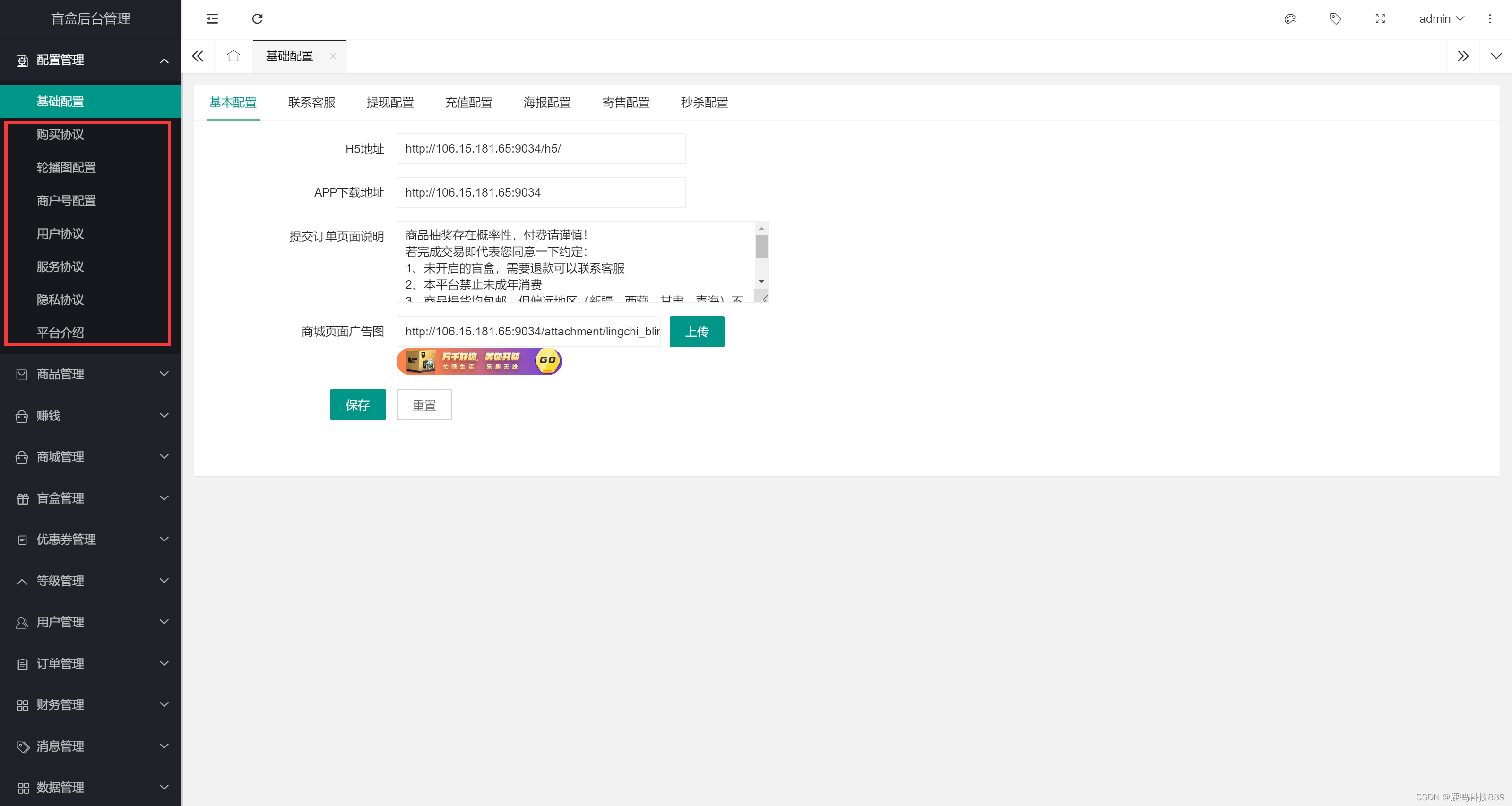 商品管理 开盲盒商品 后台编辑上传开盲盒项商品详情、价格、规格数量,前端展示