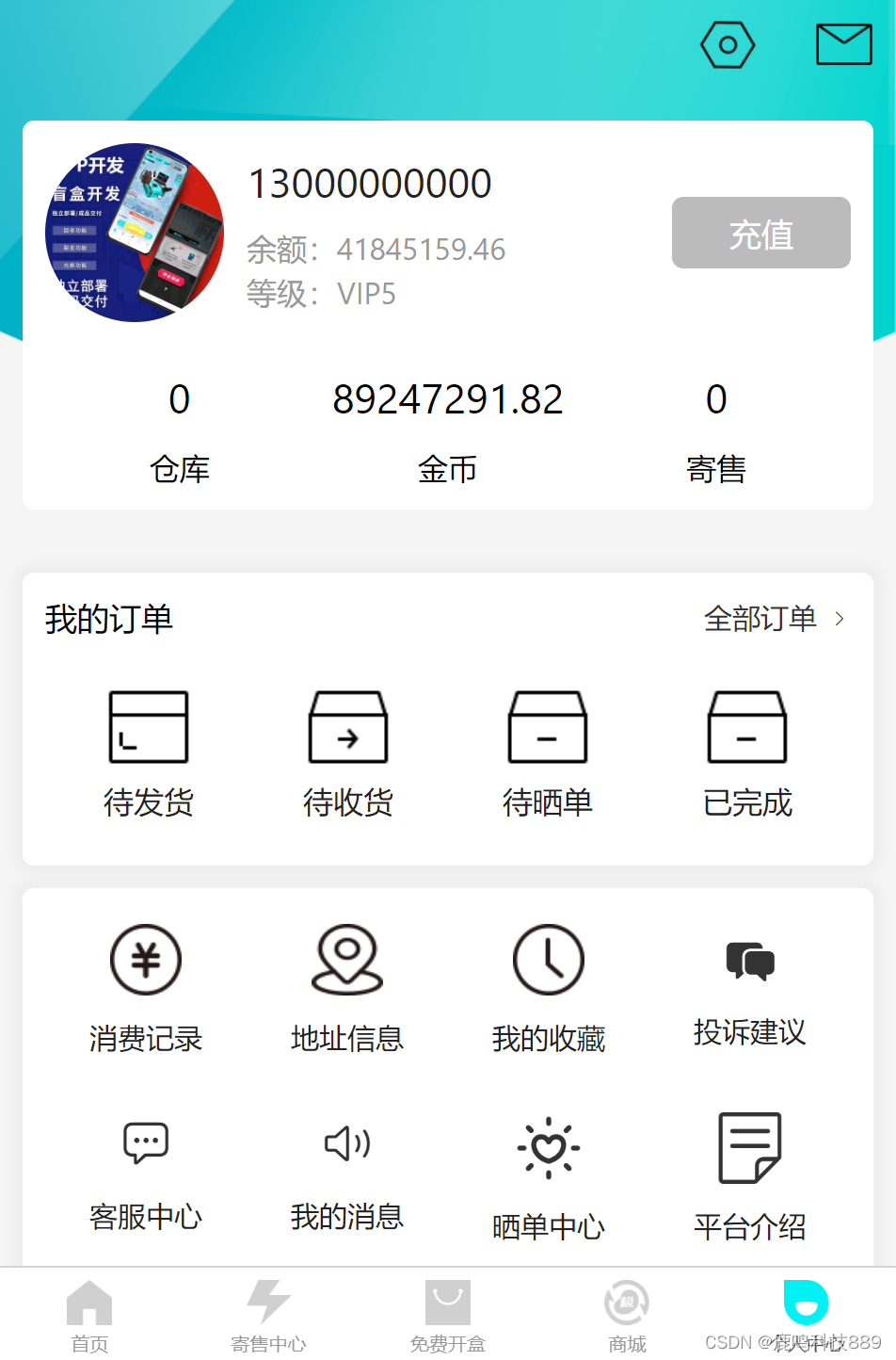 底部导航 开盲盒、寄售中心、赚钱、商城、个人中心