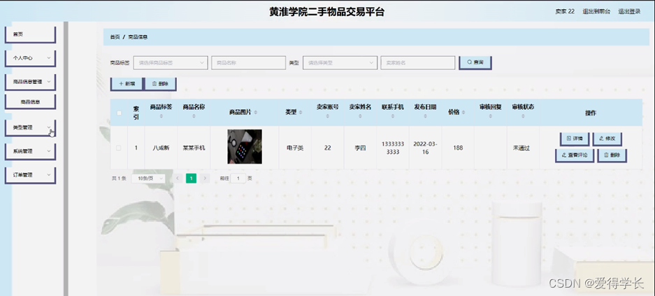 商品信息管理,卖家可在商品信息管理页面查看商品标签、商品名称、商品图片、类型、卖家账号、卖家姓名、联系手机、发布日期、价格、审核回复、审核状态等内容,还可进行新增、修改、查看评论或删除等操作,如图5-8所示。