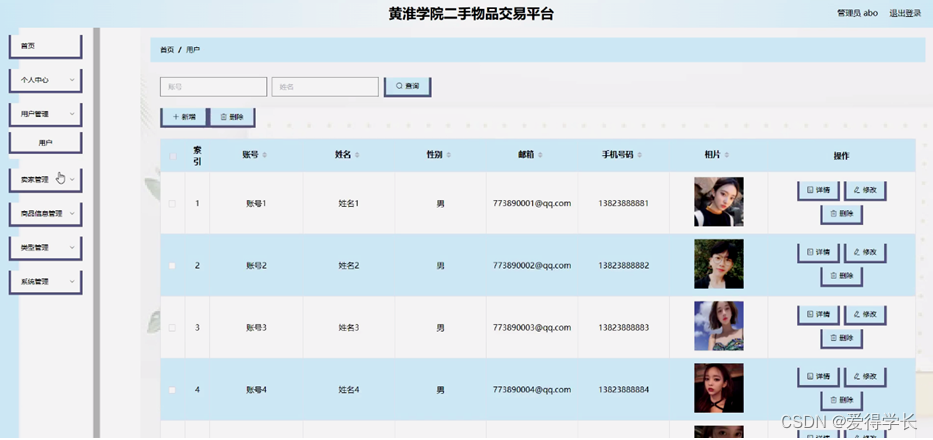 用户管理,管理员可在用户管理页面查看账号、姓名、性别、邮箱、手机号码、相片等内容,还可进行新增、修改或删除等操作,如图5-13所示。