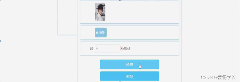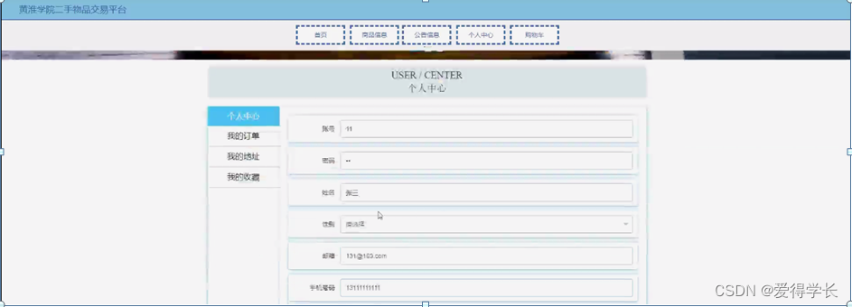 个人中心,用户可在个人中心页面通过输入账号、密码、姓名、性别、邮箱、手机号码、上传图片、余额等内容进行更新想或查看我的订单、我的地址、我的收藏等内容,如图5-3所示。