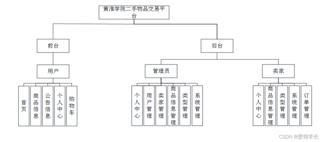 系统功能结构图是系统设计阶段,系统功能结构图只是这个阶段一个基础,整个系统的架构决定了系统的整体模式,是系统的根据。黄淮学院二手物品交易平台的整个设计结构如图3-1所示。