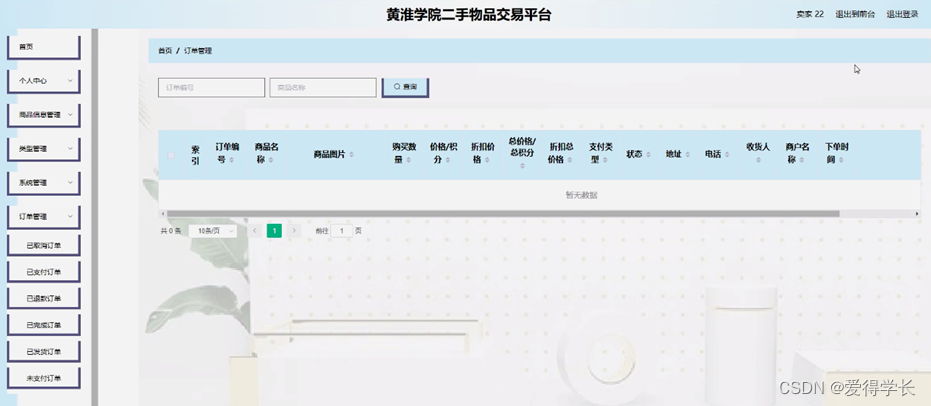 卖家通过登录进入系统可查看个人中心、商品信息管理、联系管理、系统管理、订单管理等内容,如图5-7所示。