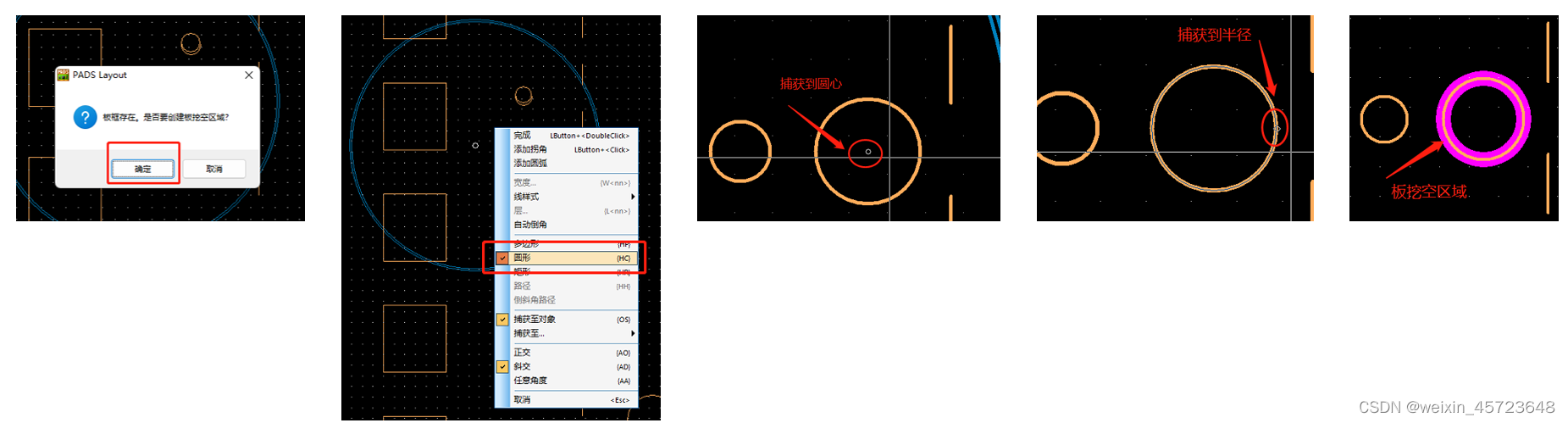 2、弹出以下对话框,选择《确定》,在开启对象捕获的前提下,右键选择《圆形》,移动光标即可捕获到圆形的圆心,点击圆心后,再移动光标捕获到圆形的半径,点击半径后,即可画出和原圆形大小的板挖空区域。