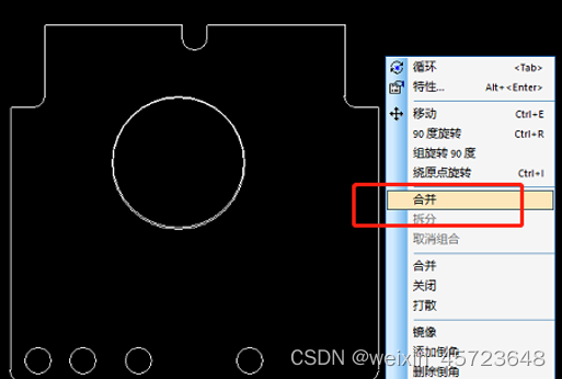 1、将装配顶层或者装配底层作为板框均可,此处将装配顶层作为板框。将装配底层设为不显示后,选择装配顶层作为板框的线条,然后右键,如果只有《选择形状》这个选项,说明结构图已经是一个形状了,此时只需要点击《选择形状》,再右键选择《关闭》。若结构图不是一个形状,则需先《合并》;若无法《关闭》,则说明结构图存在多根线或线和线的端点没有很好的来连接上。