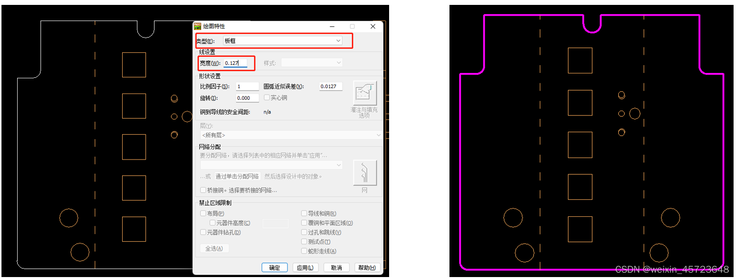 2、选择上一步合成的形状,右键,选择《特性》,将《类型》改为《板框》,将《宽度》改为0.127mm或5mil。板框如右图所示。