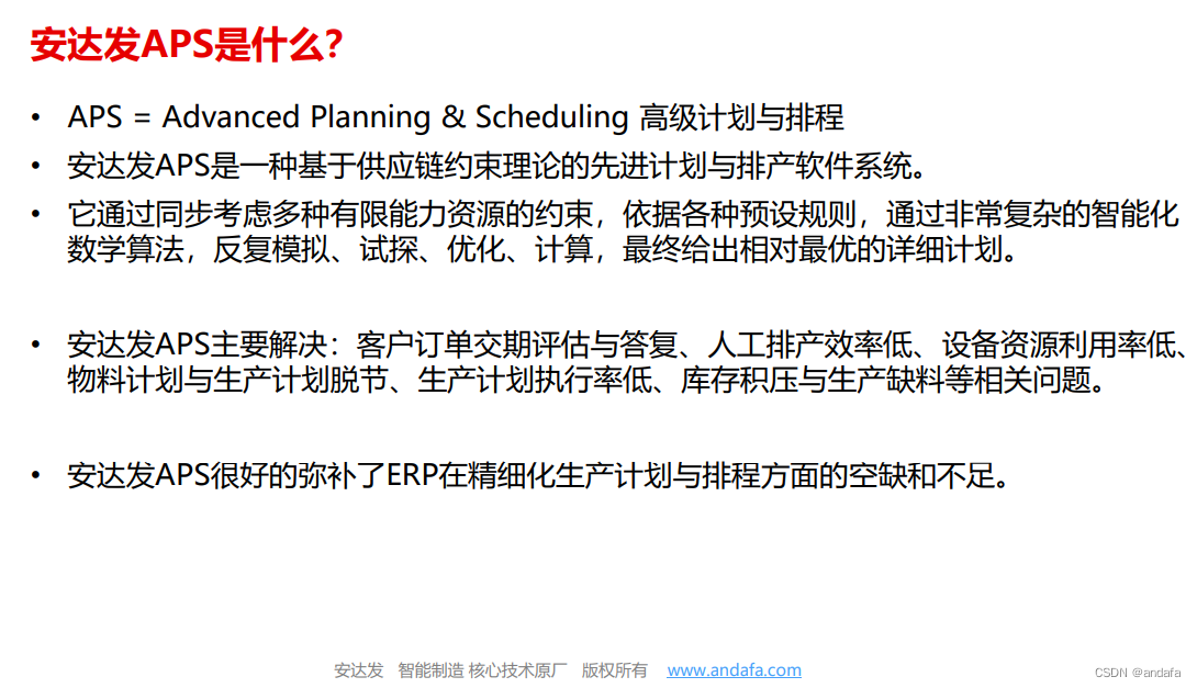APS计划排产通过销售预测、物流运输计划、生产需求计划、智能优化排产、高级物料需求计划、供应商交货计划为企业提供供应链全流程计划与排产解决方案,实现交货需求、生产计划、采购计划、自制件、外购件的拉动式协同供应,从而显着减少交期延误、库存积压、与生产欠料等重大问题。