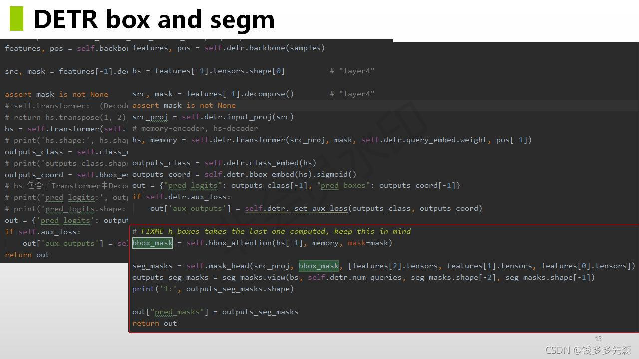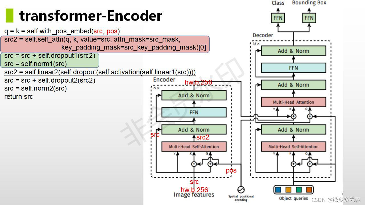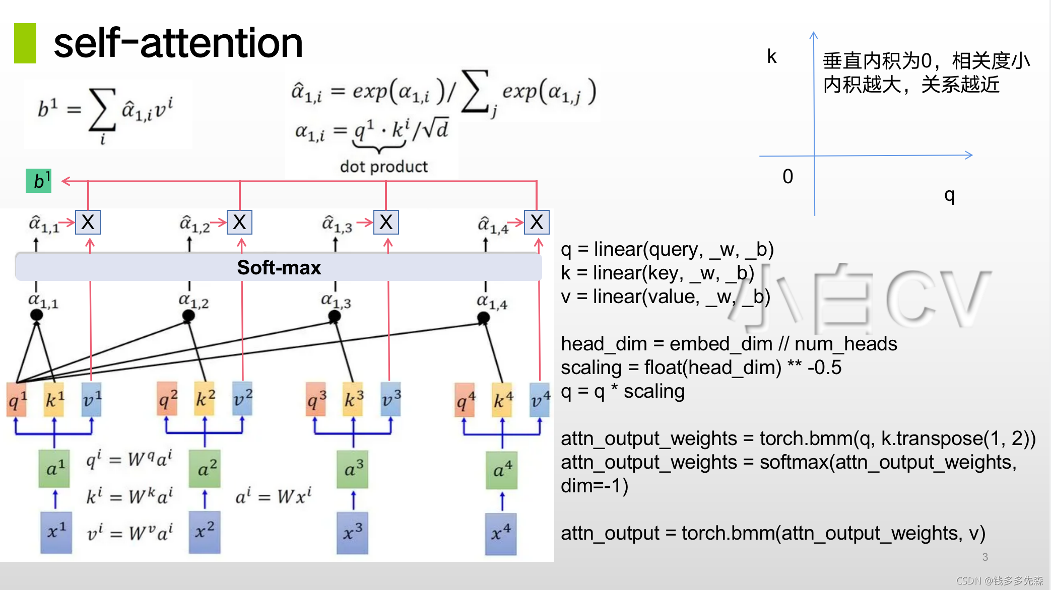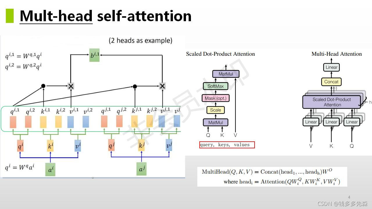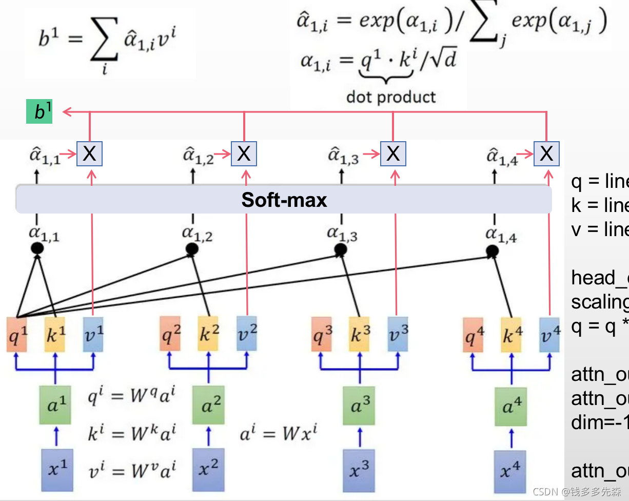 论文中的这句话应该描述的算是比较简单清楚的,下面我们再通过PPT中的数据传递关系(上图self-attention)和定义attention function的代码,确认下理解思路是否正确。