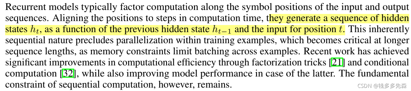 上图,在循环神经网络RCNN中,下一个时刻的输出ht要依赖于上一个时刻的输出ht-1,从而导致无法在整个序列上进行并行处理,这会引起训练时间过长的问题。这样就没法实现翻译预测阶段的并行化,效率会相对比较低。