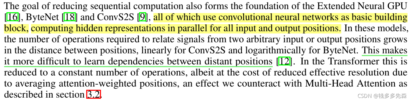 This makes it more diffificult to learn dependencies between distant positions。在这些模型中,从两个任意输入或输出位置关联信号所需要的操作数之间的距离,ByteNet是线性的和 ConvS2S是对数增长的。