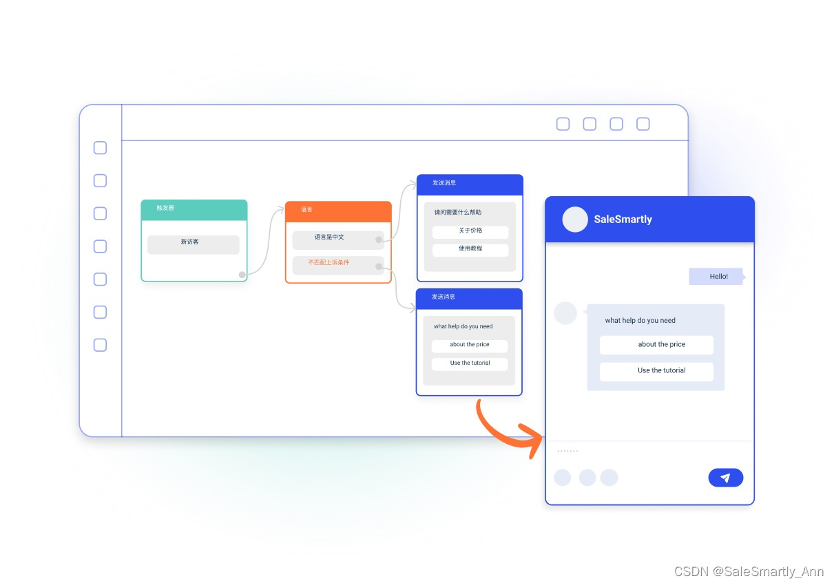 商家可以创建一次WhatsApp问候消息并将其设置为在新联系人发送消息时立即触发。即使商家不在线,也可以进行交流,这使品牌可以与其客户(或潜在客户)建立联系。要创建此类自动化,需要使用WhatsAppBusinessApp或WhatsAppBusinessAPI。SaleSmartly可让您使用官方API发送WhatsApp问候语,无需等待官方长时间审核就可获得商业号码,随租随用,低门槛更高效,让你更快速的与客户建立联系。SaleSmartly官网链接:https://www.salesmartly.com/?source=CSDN-wh1008