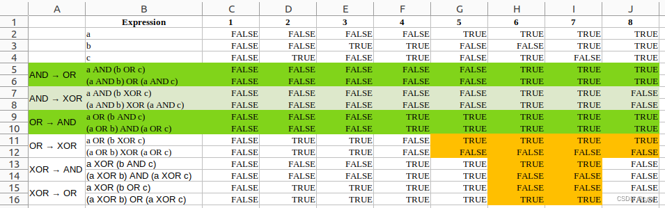 | XOR → AND | a XOR (b AND c) | FALSE | FALSE | FALSE | TRUE | TRUE | TRUE | TRUE | FALSE |