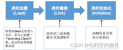当程序主动使用某个类时,如果该类还未加载到内存中,则系统会通过如下三个步骤来对该类进行初始化。