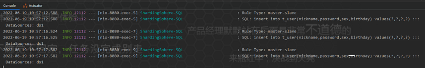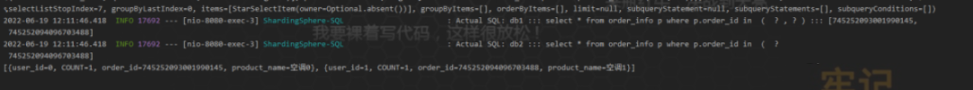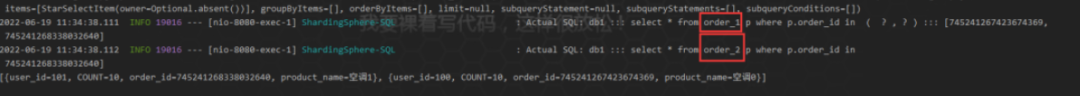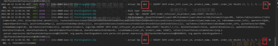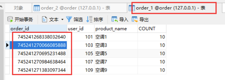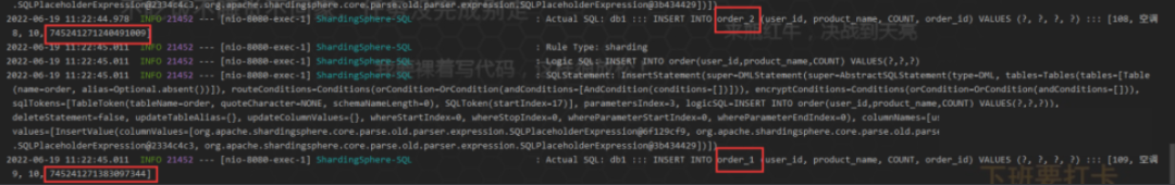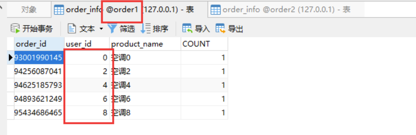 这么看下来,保存的数据是没问题的,从水平切分来看,把数据分别保存了order1和order2库中的 order_info 里面,也就是说数据算是水平切分到了不同的数据库对应的表中。
