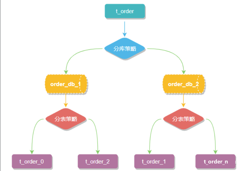 数据节点是分库分表中一个不可再分的最小数据单元(表),它由数据源名称和数据表组成,例如上图中 order_db_1.t_order_0、order_db_2.t_order_1 就表示一个数据节点。