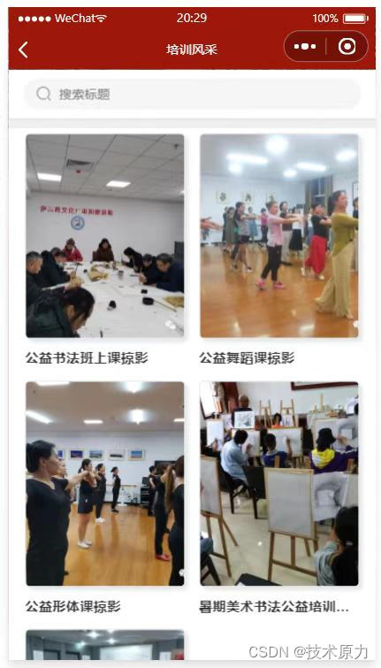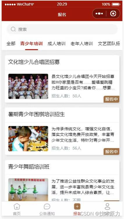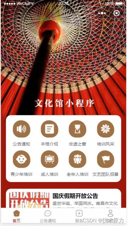 各地文化馆都会举办各类展览、讲座、培训等,普及科学文化知识,开展社会教育!本系统前后端完整,主要功能包括公告通知,非遗介绍,文化活动,课堂风采,培训班列表,培训课程介绍,文化团体招募,我的报名,后台培训项目管理,报名名单管理,后台通知管理,后台管理员管理等功能