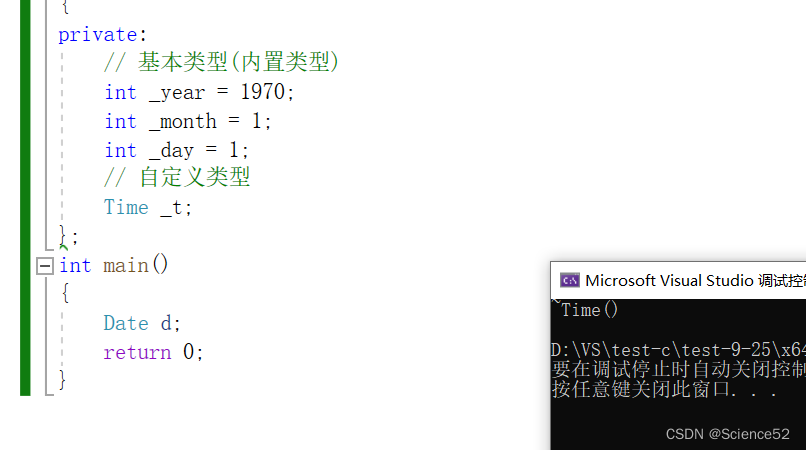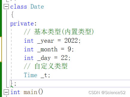 class Time { public: Time() { cout << "Time()" << endl; _hour = 0; _minute = 0; _second = 0; } private: int _hour; int _minute; int _second; }; class Date { private: // 基本类型(内置类型) int _year; int _month; int _day; // 自定义类型 Time _t; }; int main() { Date d; return 0; }