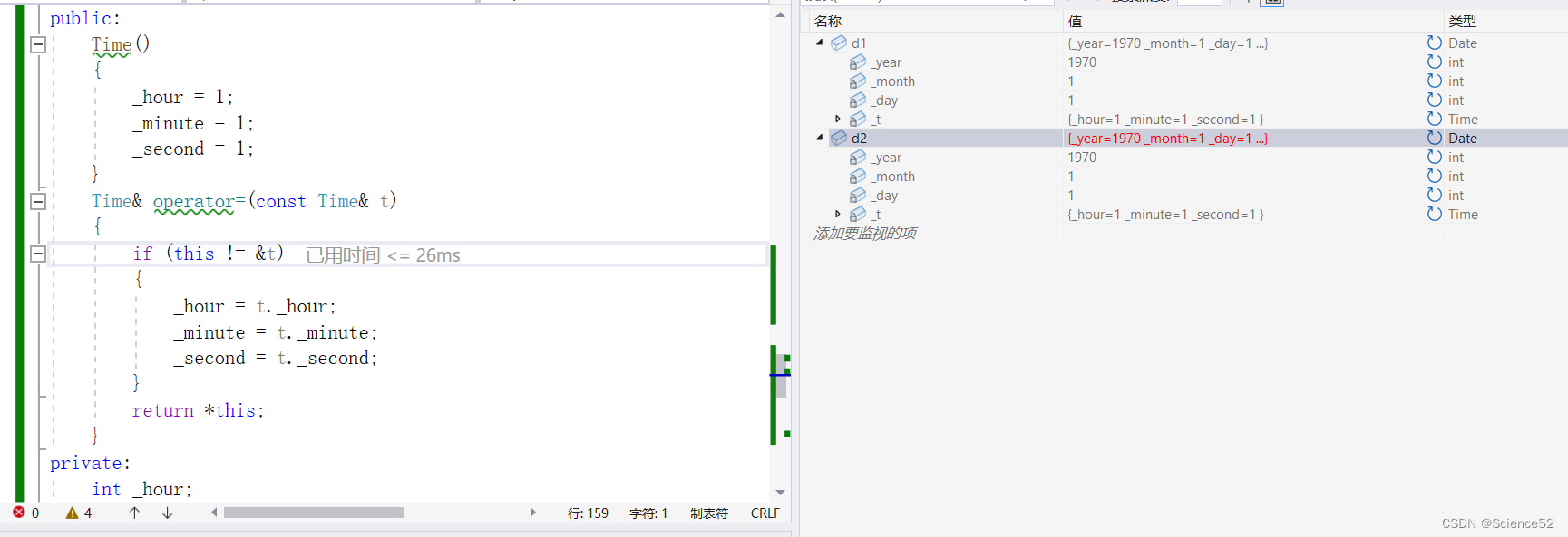 3. 用户没有显式实现时,编译器会生成一个默认赋值运算符重载,以值的方式逐字节拷贝。内置类型成员变量是直接赋值的,而自定义类型成员变量需要调用对应类的赋值运算符重载完成赋值。class Time { public: Time() { _hour = 1; _minute = 1; _second = 1; } Time& operator=(const Time& t) { if (this != &t) { _hour = t._hour; _minute = t._minute; _second = t._second; } return *this; } private: int _hour; int _minute; int _second; }; class Date { private: // 基本类型(内置类型) int _year = 1970; int _month = 1; int _day = 1; // 自定义类型 Time _t; }; int main() { Date d1; Date d2; d1 = d2; return 0; }通过调试窗口就可以发现编译器会生成默认的赋值运算符重载。