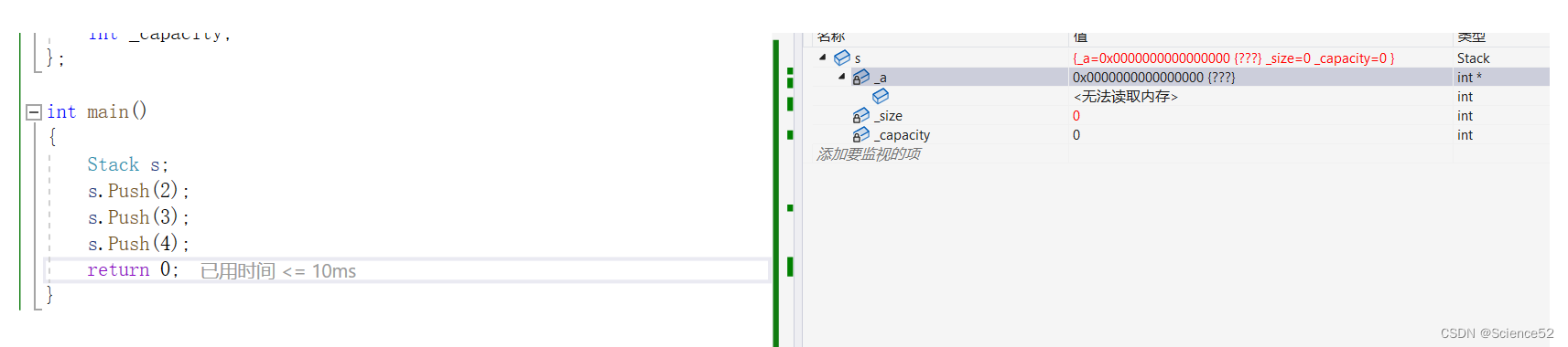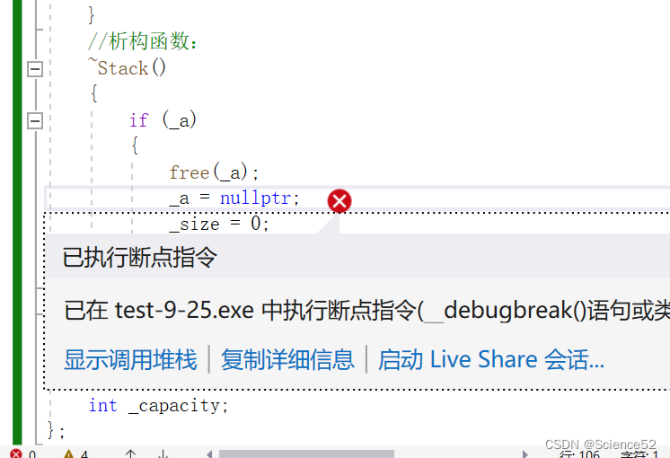 class Stack { public: //构造函数: Stack(int capacity = 4) { _a = (int*)malloc(capacity * sizeof(int)); if (_a == NULL) { perror("malloc fail"); exit(-1); } _capacity = capacity; _size = 0; } void Push(int x) { _a[_size++] = x; } //析构函数: ~Stack() { if (_a) { free(_a); _a = nullptr; _size = 0; _capacity = 0; } } private: int* _a; int _size; int _capacity; };通过调试,我们不难发现,在main函数结束的时候会自动调动析构函数。