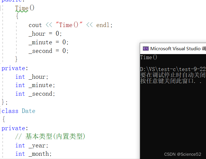 5. 关于编译器自动生成的析构函数,是否会完成一些事情呢?下面的程序我们会看到,编译器 生成的默认析构函数,对自定类型成员调用它的析构函数。class Time { public: ~Time() { cout << "~Time()" << endl; } private: int _hour; int _minute; int _second; }; class Date { private: // 基本类型(内置类型) int _year = 1970; int _month = 1; int _day = 1; // 自定义类型 Time _t; }; int main() { Date d; return 0; }