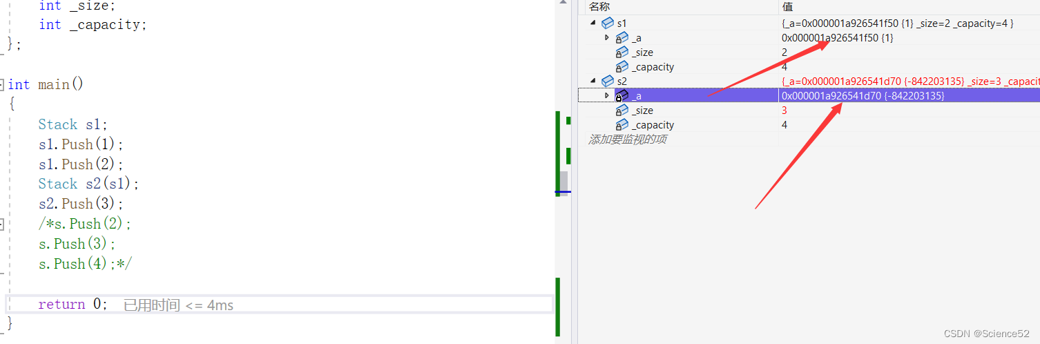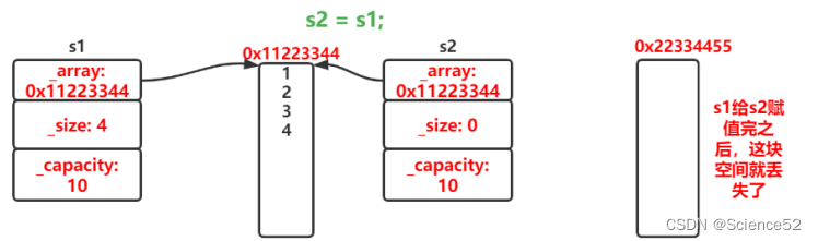 为什么呢?因为两个stack的数组用的同一块地址,其中一个先调用了析构函数,把空间释放了,另外一个又调用了析构函数,重复释放同一块空间,导致报错。