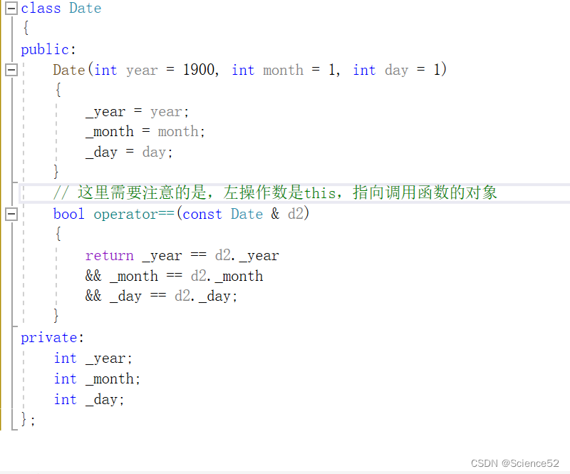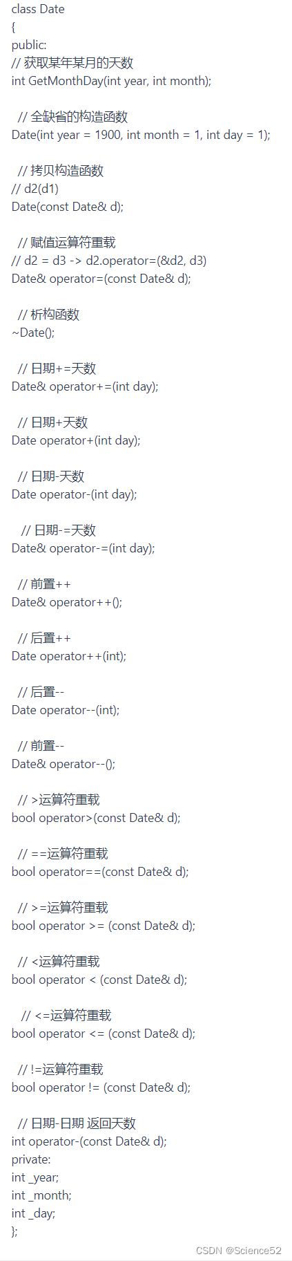 下面是代码实现:class Date { public: //int GetMonthDay(int year, int month) //{ // static int arr[13] = { 0,31,28,31,30,31,30,31,31,30,31,30,31 }; // //判断闰年 // if (month == 2 &&((year % 4 == 0 && year && 100 != 0) || year % 400 == 0)) // { // return 29; // } // return arr[month]; //} //获得一个月的天数 int GetMonthDay(int year, int month) { static int days[13] = { 0, 31, 28, 31, 30, 31, 30, 31, 31, 30, 31, 30, 31 }; int day = days[month]; if (month == 2 && ((year % 4 == 0 && year % 100 != 0) || (year % 400 == 0))) { day += 1; } return day; } // 全缺省的构造函数 Date(int year = 1900, int month = 1, int day = 1) { _year = year; _month = month; _day = day; } // 拷贝构造函数 // d2(d1) Date(const Date& d) { _year = d._year; _month = d._month; _day = d._day; } // 赋值运算符重载 // d2 = d3 -> d2.operator=(&d2, d3) Date& operator=(const Date& d) { if (this != &d)//这里要判断一个两者是否为不同的类对象,不然程序会崩溃 { _year = d._year; _month = d._month; _day = d._day; } return *this; } // 析构函数 ~Date() { _year = 0; _month = 0; _day = 0; } // 日期+=天数 Date& operator+=(int day) { //天数全部加上去之后在通过加月去减天数即可 _day += day; while (_day > GetMonthDay(_year, _month)) { _day -= GetMonthDay(_year, _month); _month++; if (_month == 13) { _year += 1; _month = 1; } } return *this; } // 日期+天数 Date operator+(int day) { Date tmp(*this);//加是返回原来的日期,所以要创建临时变量 tmp += day; return tmp; } // 日期-天数 Date operator-(int day) { Date tmp(*this); tmp -= day; return tmp; } // 日期-=天数 Date& operator-=(int day) { _day -= day; while (_day < 0) { _day += GetMonthDay(_year, _month); _month--; if (_month == 0) { _month = 12; _year--; } } return *this; } // 前置++ Date& operator++() { _day++; //判断一个最后一年的最后一个++ if (_day > GetMonthDay(_year, _month)) { _month++; if (_month > 12) { _month = 1; _year++; } _day = 1; } return *this; } // 后置++ Date operator++(int) { Date tmp(*this); *this += 1; return tmp; } // 后置-- Date operator--(int) { Date tmp(*this); *this -= 1; return tmp; } // 前置-- Date& operator--() { _day--; //判断一年最开始的一个-- if (_day < 0) { _month--; if (_month < 0) { _month = 12; _year--; } _day = GetMonthDay(_year, _month); } return *this; } // >运算符重载 bool operator>(const Date& d) { //年大则大,年同看月,月同看天 if (this->_year > d._year ) { return true; } else if (this->_year == d._year && this->_month > d._month) { return true; } else if (this->_year == d._year && this->_month == d._month) { if (this->_day > d._day) { return true; } } return false; } // ==运算符重载 bool operator==(const Date& d) { return _year == d._year && _month == d._month && _day == d._day; } // >=运算符重载 bool operator >= (const Date& d) { return *this > d || *this == d; } // <运算符重载 bool operator < (const Date& d) { if (this->_year < d._year) { return true; } else if (this->_year == d._year && this->_month < d._month) { return true; } else if (this->_year == d._year && this->_month == d._month) { if (this->_day < d._day) { return true; } } return false; } // <=运算符重载 bool operator <= (const Date& d) { return *this < d || *this == d; } // !=运算符重载 bool operator != (const Date& d) { return !(_year == d._year && _month == d._month && _day == d._day); } // 日期-日期 返回天数 int operator-(const Date& d) { //日减完到月到年 int day = _day - d._day; while (_month != d._month) { _month--; day += GetMonthDay(_year, _month); if (_month == 0) { _month = 12; _year--; } } //减年 while (_year != d._year) { _year--; if ((_year % 4 == 0 && _year % 100 != 0) || (_year % 400 == 0)) { day += 366; } else { day += 365; } } return day; } private: int _year; int _month; int _day; };