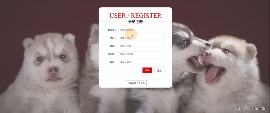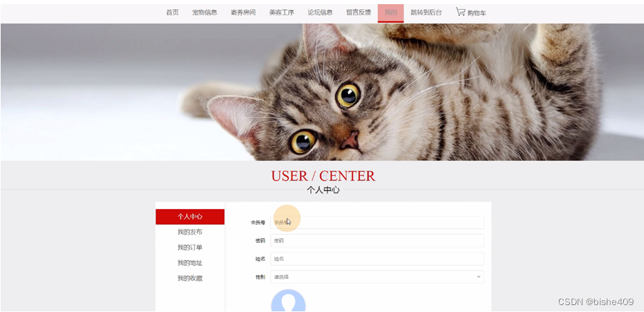 通过系统页面可以查看首页、宠物信息、寄养房间、美容工序、论坛信息、留言反馈、我的、跳转到后台、购物车等信息,如图5-1所示。通过会员注册可以填写会员号、密码、姓名、身份证、手机等信息,进行注册操作,如图5-2所示。